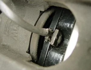 Еще одна причина клиновидного износа колодок (обычно внешних) заключается в том, что может быть немного не дотянут крепежный болт на одной из направляющих либо на скобе суппорта. Клиновидный износ также возможен при: