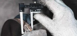 Для проверки толщины тормозного диска с помощью монеты необходимо приложить ее к рабочей поверхности диска. В большинстве случаев критический износ одной поверхности диска находится в пределах 1,5...2 мм. С помощью штангенциркуля таким образом можно узнать толщину износа как одной половины диска, так и общую толщину всего диска. Если бортик не износился измерять можно прямо от него.