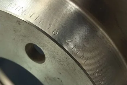 Делается это одним из двух методов. Первый — непосредственная надпись на ободке. Например, MIN. TH. 4 мм. Другой метод — метка в виде выемки на торцевой части диска, но с внутренней ее стороны (чтобы колодка не чиркала по ней). Как показывает практика, второй метод удобнее, поскольку при увеличении износа вплоть до критического диск начинает тормозить рывками, что будет наглядно ощущаться водителем при торможении.