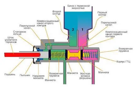 При сильном износе поршневых уплотнений ГТЦ перепускает: жидкость проходит между стенками корпуса первого, второго или обоих поршней в обратном направлении и возвращается в расширительный бачок. В результате в соответствующем контуре не создается давление, необходимое для воздействия на тормозные цилиндры.