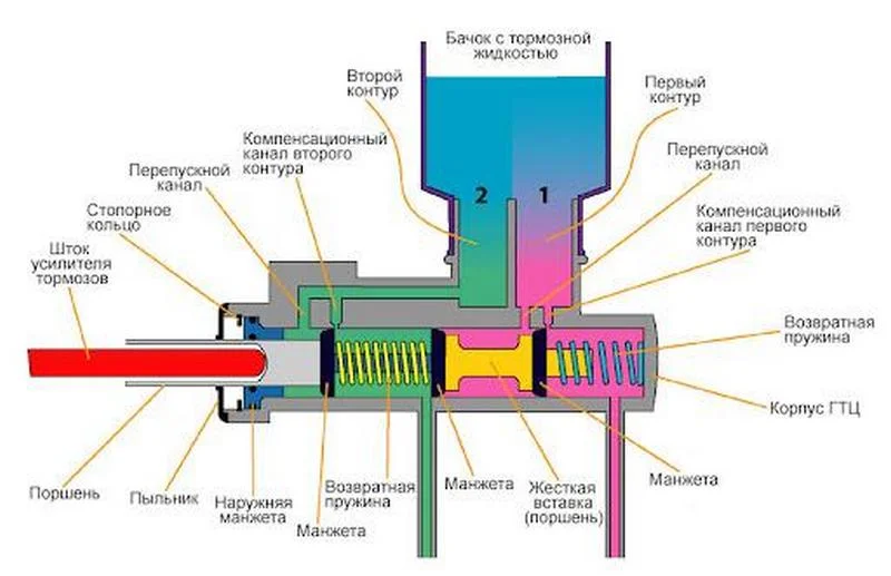 На автомобилях используется система с двумя раздельными гидравлическими контурами. Подробно о его задаче и работе можете почитать отдельно. Общий же принцип тот, что при нажатии педали тормоза шток вакуумного усилителя воздействует на первый поршень ГТЦ, который за счет сжатия подаваемой из бачка тормозной жидкости создает избыточное давление в контуре 1 напрямую, а в контуре 2 косвенно – путем перемещения второго поршня.