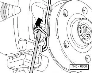 - На левом тормозном механизме отсоединить разъем 1 индикатора износа тормозных накладок;