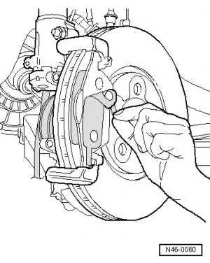 Перед установкой новых тормозных накладок вдавить поршень с помощью специального инструмента в цилиндр. Перед вдавливанием откачать тормозную жидкость из бачка с тормозной жидкостью с помощью емкости для прокачки. Иначе в случае последующего долива жидкости она может вытечь и вызвать повреждения.