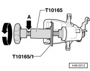- Установить инструмент для установки в исходное положение -T 10165- на поршень корпуса тормозного суппорта;
