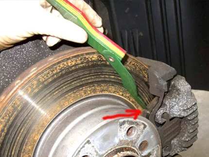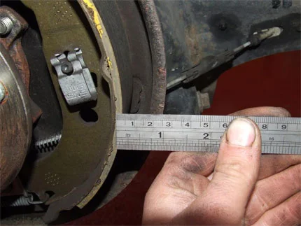 Для проверки накладок нужно снять колесо и через отверстие в корпусе суппорта визуально определить толщину накладки. У задних колес нужно снять тормозной барабан и замерить толщину накладок штангенциркулем.