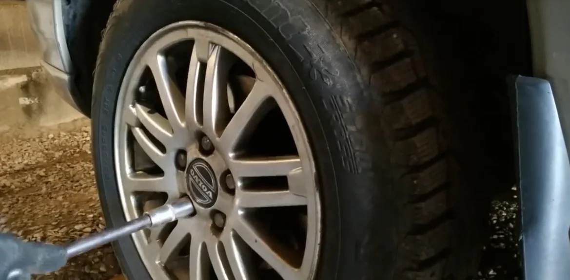- Поддомкрачиваем и снимаем левое колесо. Не забываем что-то подставить для страховки под порог.
