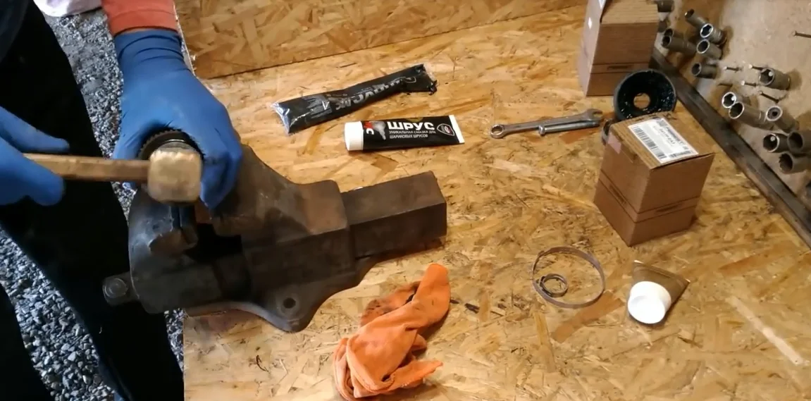 - Закладываем свежую смазку в шарнир, а также меняем стопорное кольцо на валу.