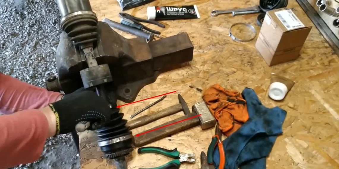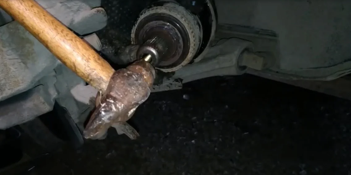 - Привод немного оттягиваем на себя чтобы он был на весу и держа его за сам шарнир бьем молотком по головке болта и тем самым сбиваем шарнир с вала.