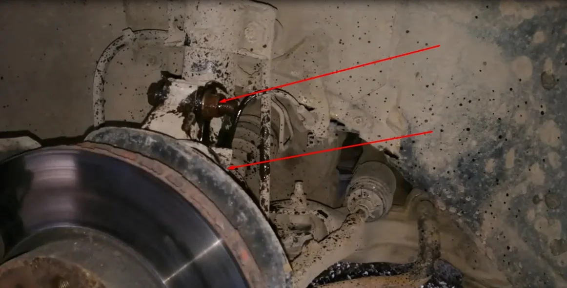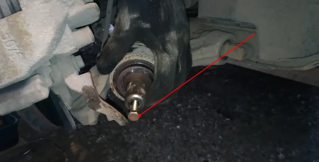 - Фиксируем ступицу от поворота и выкручиваем болт крепления привода под головку на четырнадцать. Также можно этот болт выкрутить когда автомобиль еще на колесах, снимаете крышку в колесном диске и выкручиваете.