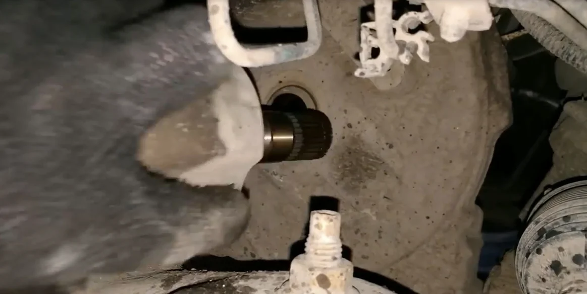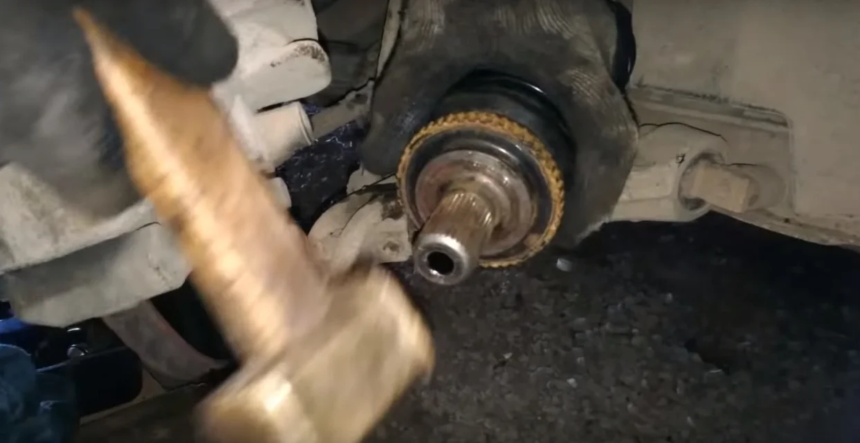 - Делаем несколько несильных ударов через латунную проставку, в то место где вставляется внутренний ШРУС в АКПП. Таким образом мы стронем привод на шлицах.