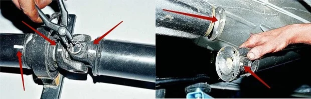 1) Чтобы снять карданный вал нужно открутить ключом на 13 два болта крепления подвесного подшипника к поперечной опоре. Затем открутить гайки соединения кардана с хвостовиком заднего моста. После снятия кардана нужно отметить положение вилок, чтобы не было дисбаланса. В противном случае карданный вал будет «бить».