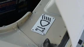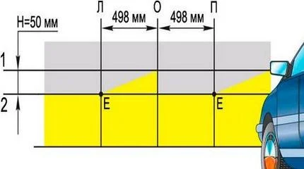 - Zeichnen Sie an der Wand eine horizontale Linie unterhalb dieses Niveaus. Der Neigungswinkel ist bei Nebelscheinwerfern meist größer als beim Hauptlicht (oft 2 % oder 4 %). Beispiel: Bei 2 % Neigung und 5 Metern Abstand muss die Linie 10 cm unter der Scheinwerfermitte liegen.