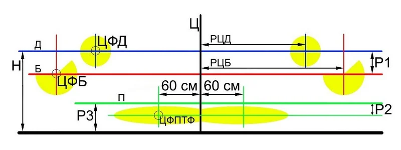 C — Mittelachse des Fahrzeugs; D — Linie der Scheinwerfermittelpunkte; B — Linie für das Abblendlicht (unterhalb von D um den Betrag der Neigung);