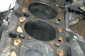 Riefen und Verschleiß der Zylinderwände. Bei hoher Laufleistung verlieren die Zylinder ihre Form (werden unrund/oval), und es entstehen Riefen. Die Ringe können nicht mehr dicht an den Wänden anliegen, und Öl gelangt in den Brennraum. Reparatur: Aufbohren des Blocks auf Übermaß oder Einsetzen neuer Laufbuchsen.