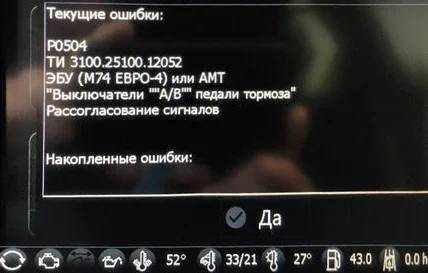 Information about the state of both contacts is sent to the ECU. If their values do not correspond to each other—for example, if both contacts are closed or open simultaneously, or if the accelerator pedal is pressed while the brake pedal is registered as depressed—error P0504 is generated.
