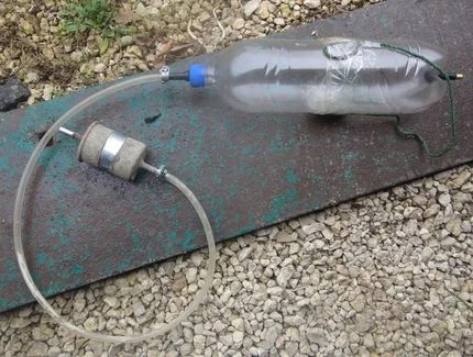 - Pour the solvent into the bottle, screw it shut, and hang it from the bonnet. Connect the compressor to the bottom of the bottle and create a pressure of 2–2.5 bar.