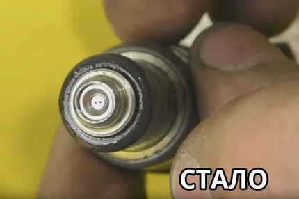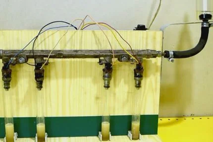 Do not keep the injector open constantly — this can overheat the coil, and cleaning efficiency will decrease (dirt is dislodged precisely at the moment of opening/closing). Repeat the procedure until the spray pattern becomes even, without solid jets.